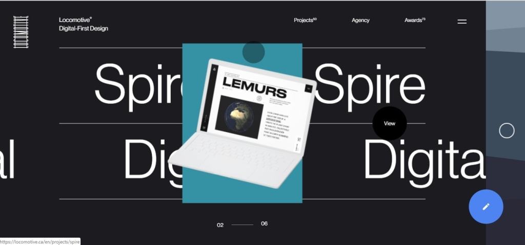 Canadian (Quebec-based) studio Locomotive also makes use of movement and interactive features on their home page. Their playful and colourful animations are used against an elegant and timeless black backdrop, and they say a lot about their work.When you click on the Projects page, you’re greeted with the message: “Locomotive develops, designs and delivers websites and creative campaigns that drive results, build awareness and win awards. Our work never brags, but it sure loves to speak for itself.” And they certainly do that very well.Back on the home page, an intriguing and attractive blue button on the right-hand side featuring a pencil icon will soon get your attention. And you certainly won’t be disappointed once you click on it – you’ll want to check out their humorous copy and use of the voice feature!