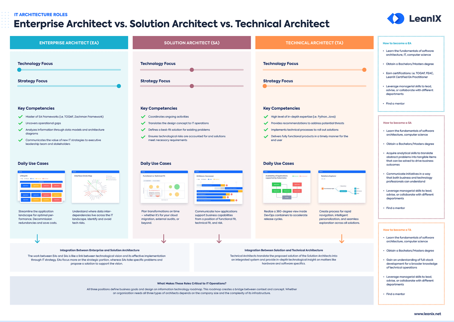 It’s important to understand that enterprise architects and solution architects are not opposed to each other but form a synergy with technical architects. All three are integral elements when it comes to maximizing the value that a company can generate through the use of technology. Although there might be overlaps between EA and SA, they have different functions and depend on each other as solution architects take the abstract strategy developed by enterprise architects and turn it into a solution.